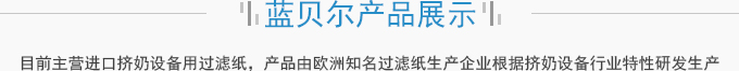 濟(jì)南藍(lán)貝爾工貿(mào)有限公司主要產(chǎn)品擠奶設(shè)備過濾紙,牛奶過濾紙,擠奶機(jī)過濾袋,目前主營(yíng)進(jìn)口擠奶設(shè)備用過濾紙,產(chǎn)品由歐洲知名過濾紙生產(chǎn)企業(yè)根據(jù)擠奶設(shè)備行業(yè)特性研發(fā)生產(chǎn),產(chǎn)品符合歐盟食品接觸標(biāo)準(zhǔn)及FDA食品接觸標(biāo)準(zhǔn),產(chǎn)品在擠奶設(shè)備過濾紙行業(yè)占有70%以上的份額。并通過了SGS標(biāo)準(zhǔn)技術(shù)檢測(cè)中心按國(guó)標(biāo)食品級(jí)標(biāo)準(zhǔn)進(jìn)行的檢測(cè)。產(chǎn)品適用于各種擠奶設(shè)備品牌,本公司目前獲得該區(qū)域產(chǎn)品營(yíng)銷資格。產(chǎn)品已用于國(guó)內(nèi)各大乳企所屬...